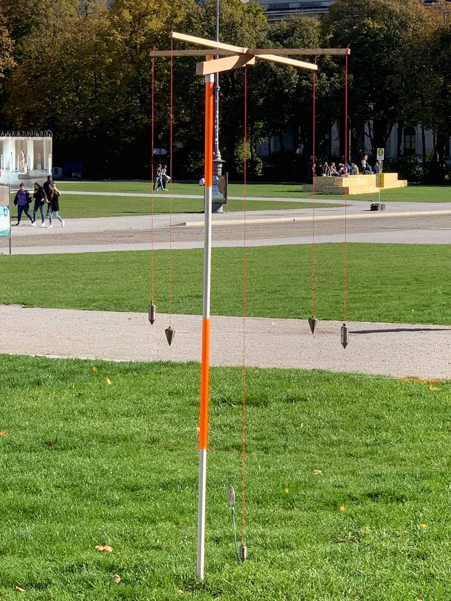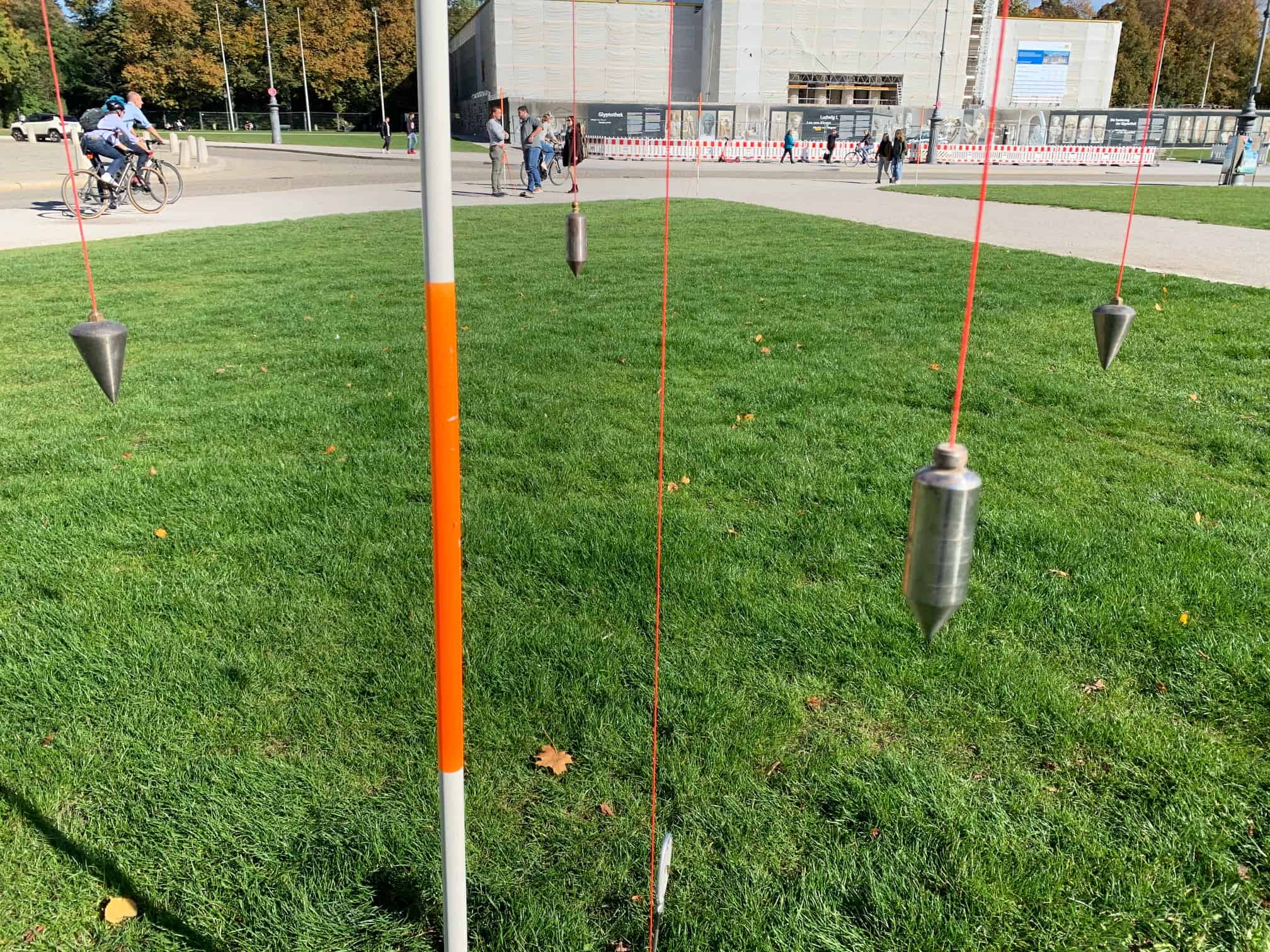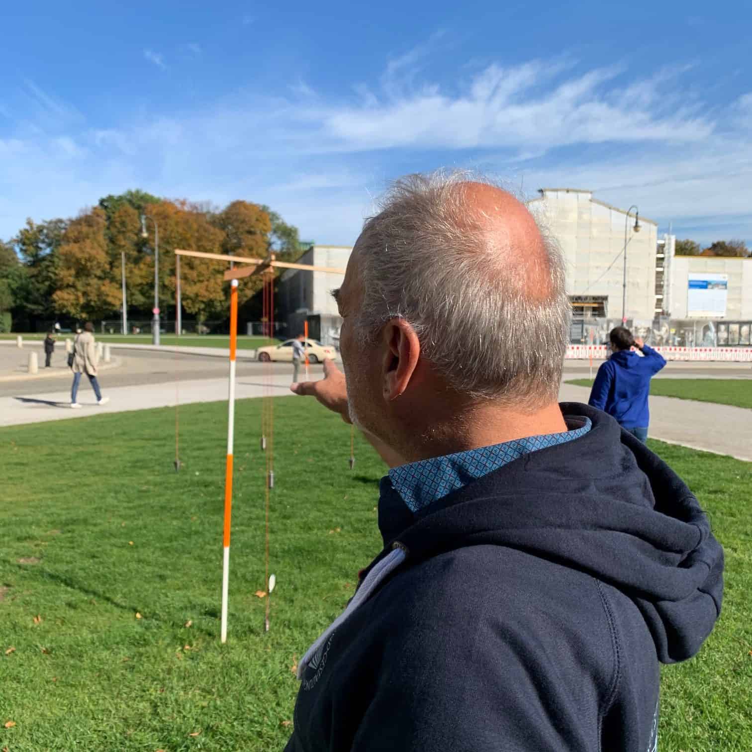 Wir haben es den alten Römern gleich getan und auf dem Königsplatz die Groma ausprobiert. Das Ergebnis haben wir mit dem von modernen Messinstrumenten verglichen. Zu unserem großen Erstaunen lagen die Messungen sehr nahe beieinander! Auf 100m Entfernung war kein nennenswerter Messfehler durch Überprüfung mit einem Winkelprisma festzustellen!