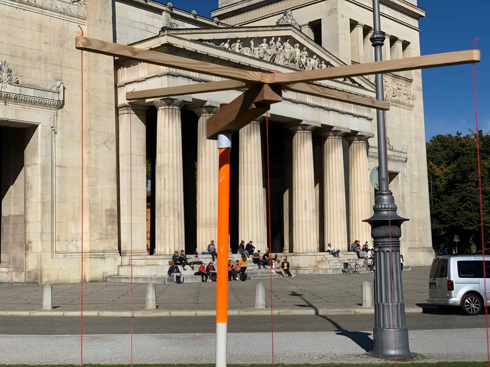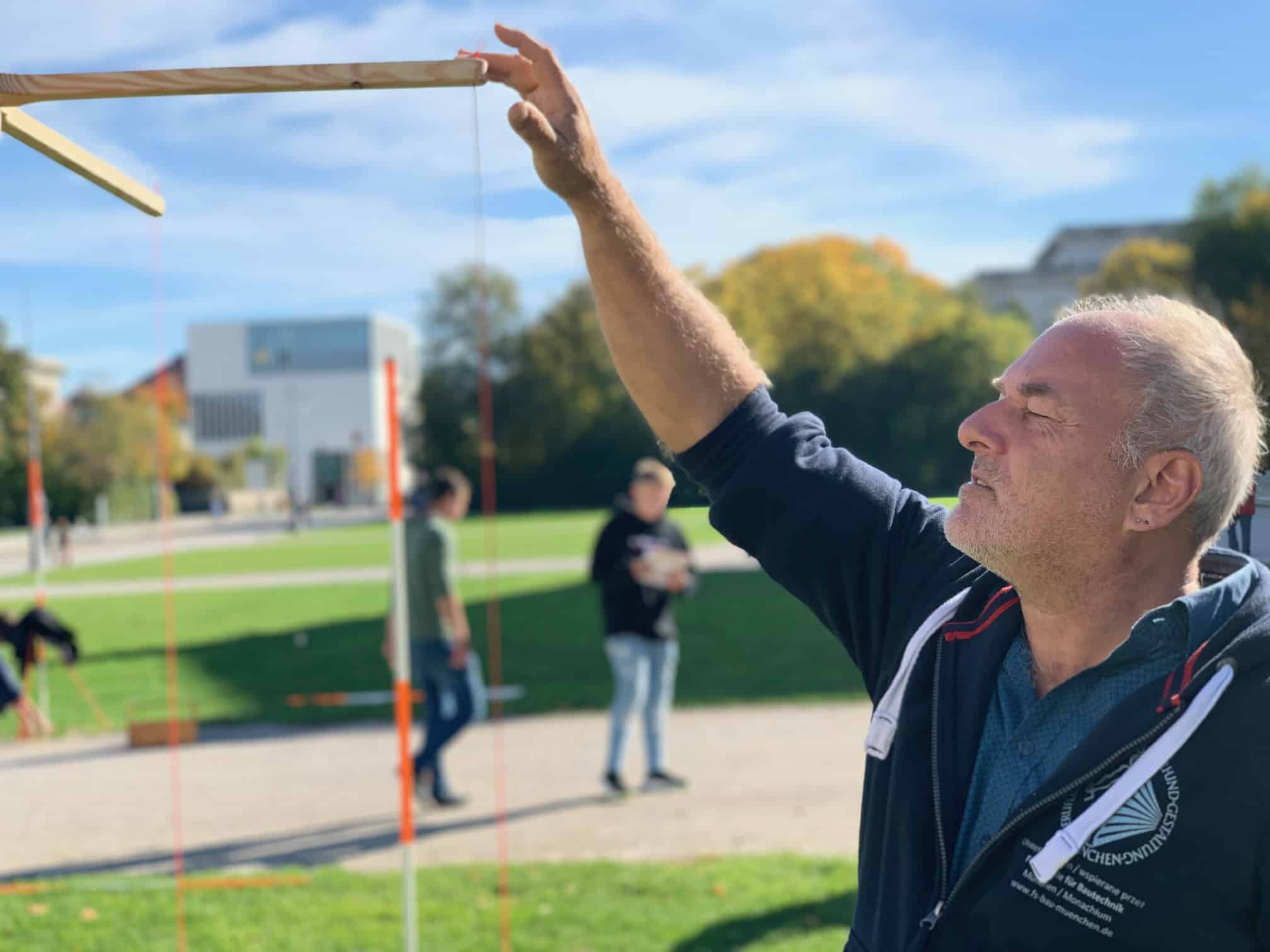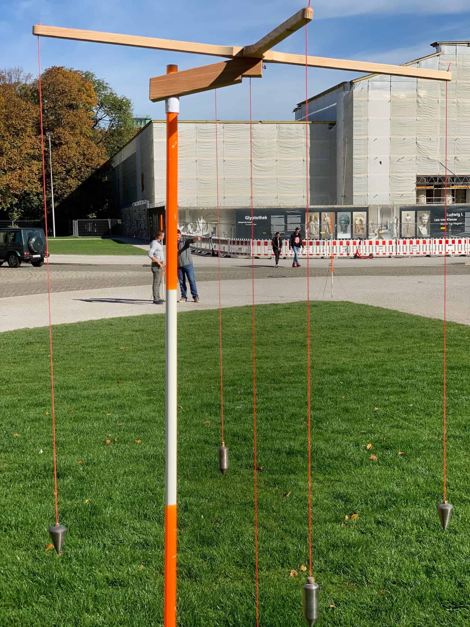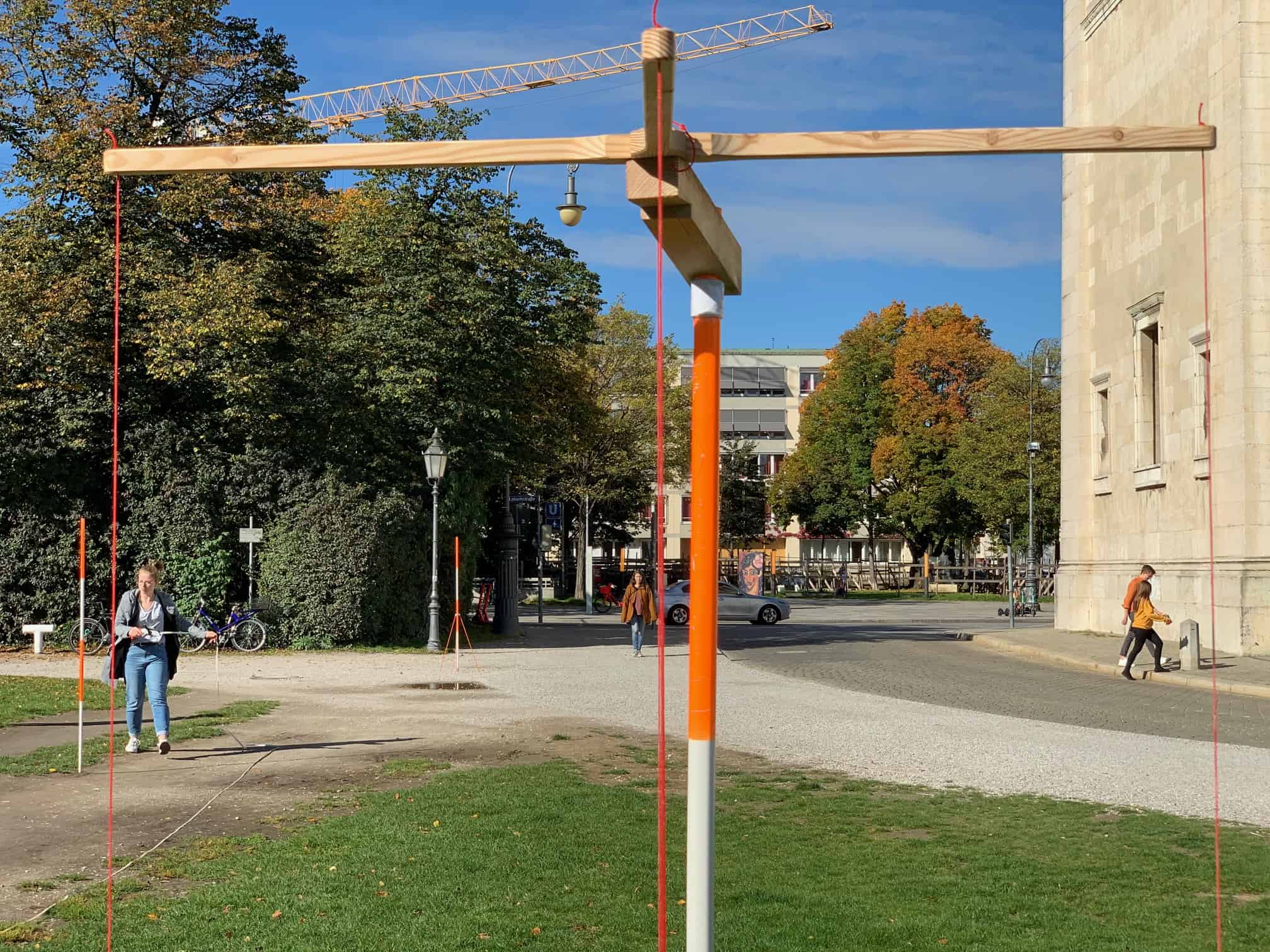 Wir haben es den alten Römern gleich getan und auf dem Königsplatz die Groma ausprobiert. Das Ergebnis haben wir mit dem von modernen Messinstrumenten verglichen. Zu unserem großen Erstaunen lagen die Messungen sehr nahe beieinander! Auf 100m Entfernung war kein nennenswerter Messfehler durch Überprüfung mit einem Winkelprisma festzustellen!