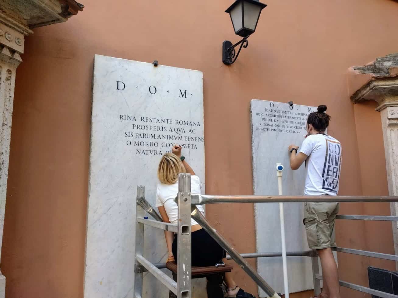 Der Campo Santo Teutonico ist ein kleiner Friedhof für Deutschsprachige im Vatikanstaat, der bereits seit dem 8.Jhdt. besteht. Bereits seit 2002 kommen regelmäßig SteinmetzschülerInnen unseres Schulzentrums nach Rom, um die Grabsteine, die rund 1.400 Namen nennen, instand zu halten. Seit vielen Jahren geschieht dies auch in bester Kooperation mit unseren SchülerInnen, die eine Vorbildung als Maurer/in bzw. Bauzeichner/in haben und den SteintechnikerInnen unterstützend bei Aufmaß bzw. Ein- und Ausbau der Epitaphien, etc. behilflich sind. So begann – ähnlich wie für die Projektteilnehmer des EU-Projekts in Rumänien, das neue Schuljahr bereits Ende August. Folgende Arbeiten wurden durchgeführt: Es wurden verschiedene Grabsteine, Schrifttafeln und Kreuzgangstationen gesäubert, Fehlstellen im Putz der Friedhofsmauer ausgebessert und vor allem die komplette Außenmauer des Campo Santo Teutonico vermessen und gezeichnet. Zudem wurde auch theoretische Forschung in Form von Exkursionen zu historisch bedeutsamen Orten (Forum Romanum, etc.) betrieben. So kann das Team 2018 mit den begleitenden Kollegen Robert Klier und Christoph Obel auf eine intensive Erkundung des alten und neuen Roms zurückblicken! Mille grazie!